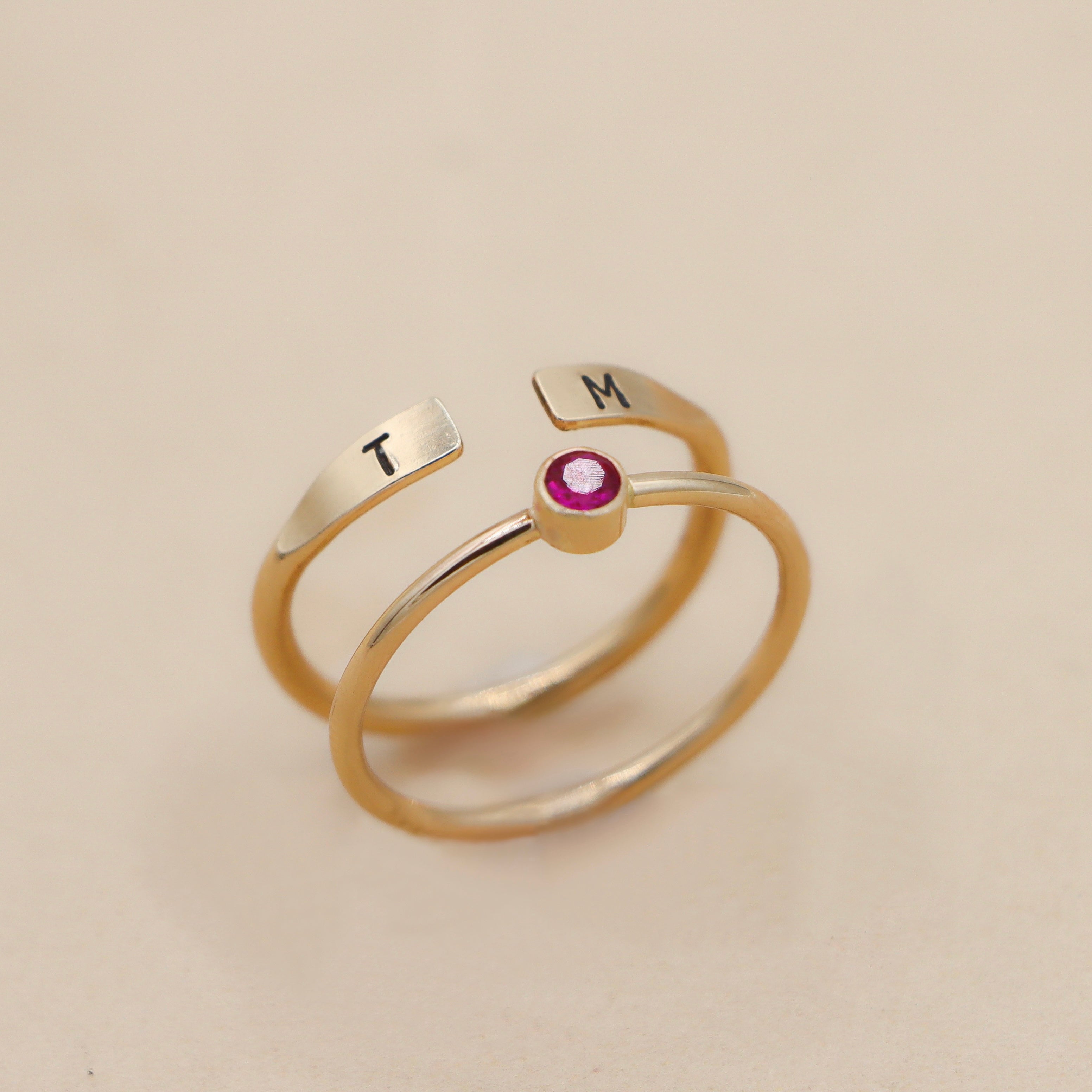14K Solid Gold Birthstone and Initial Ring Set