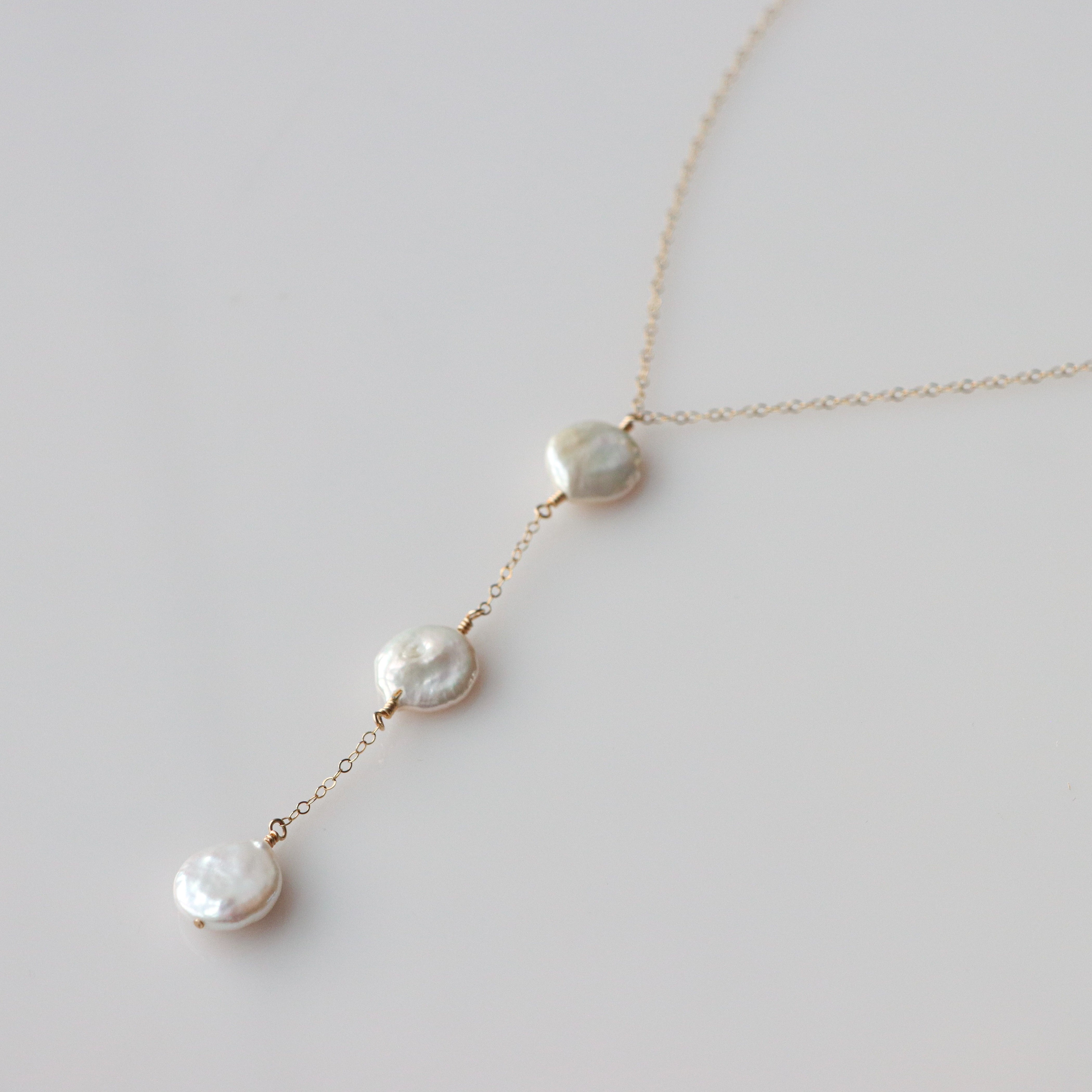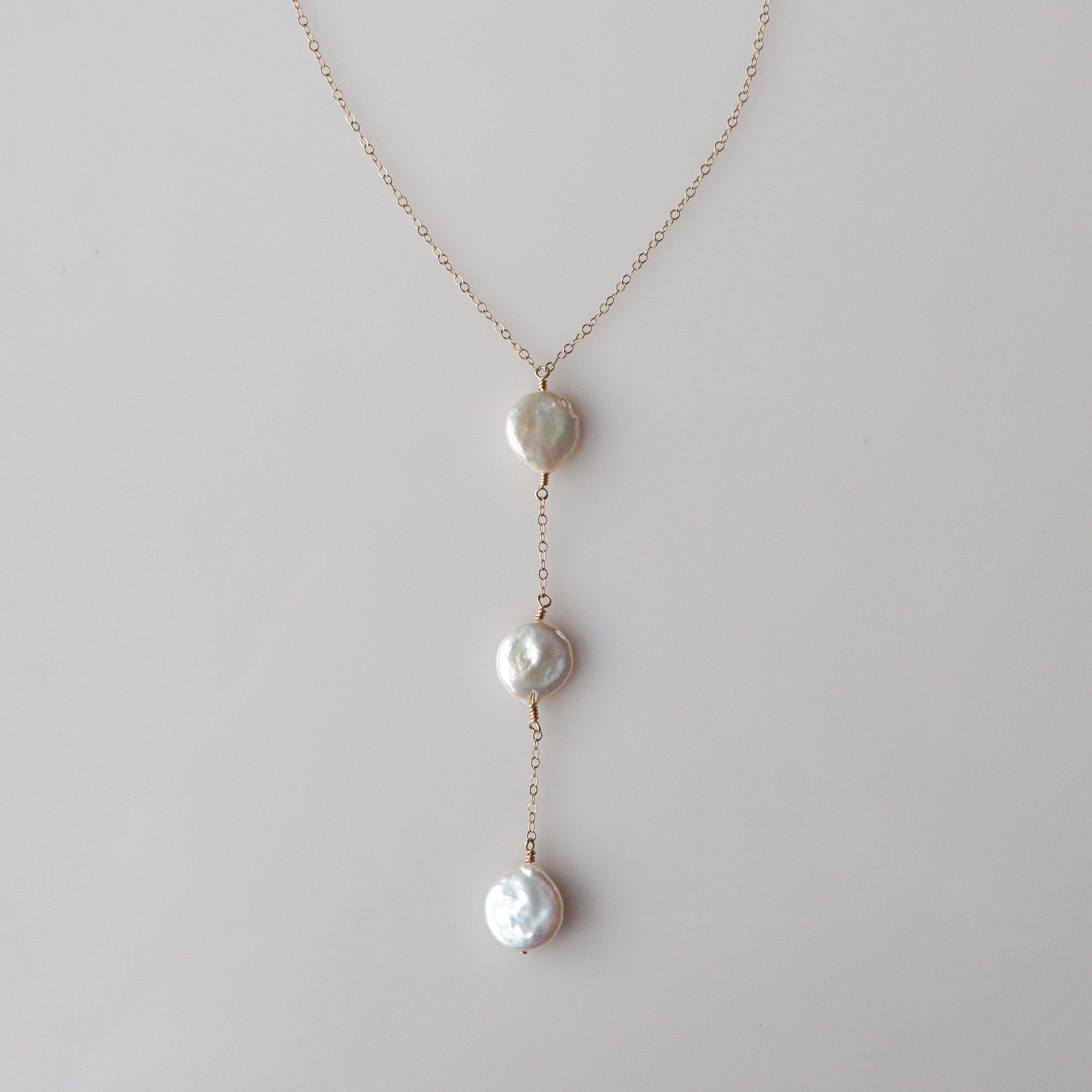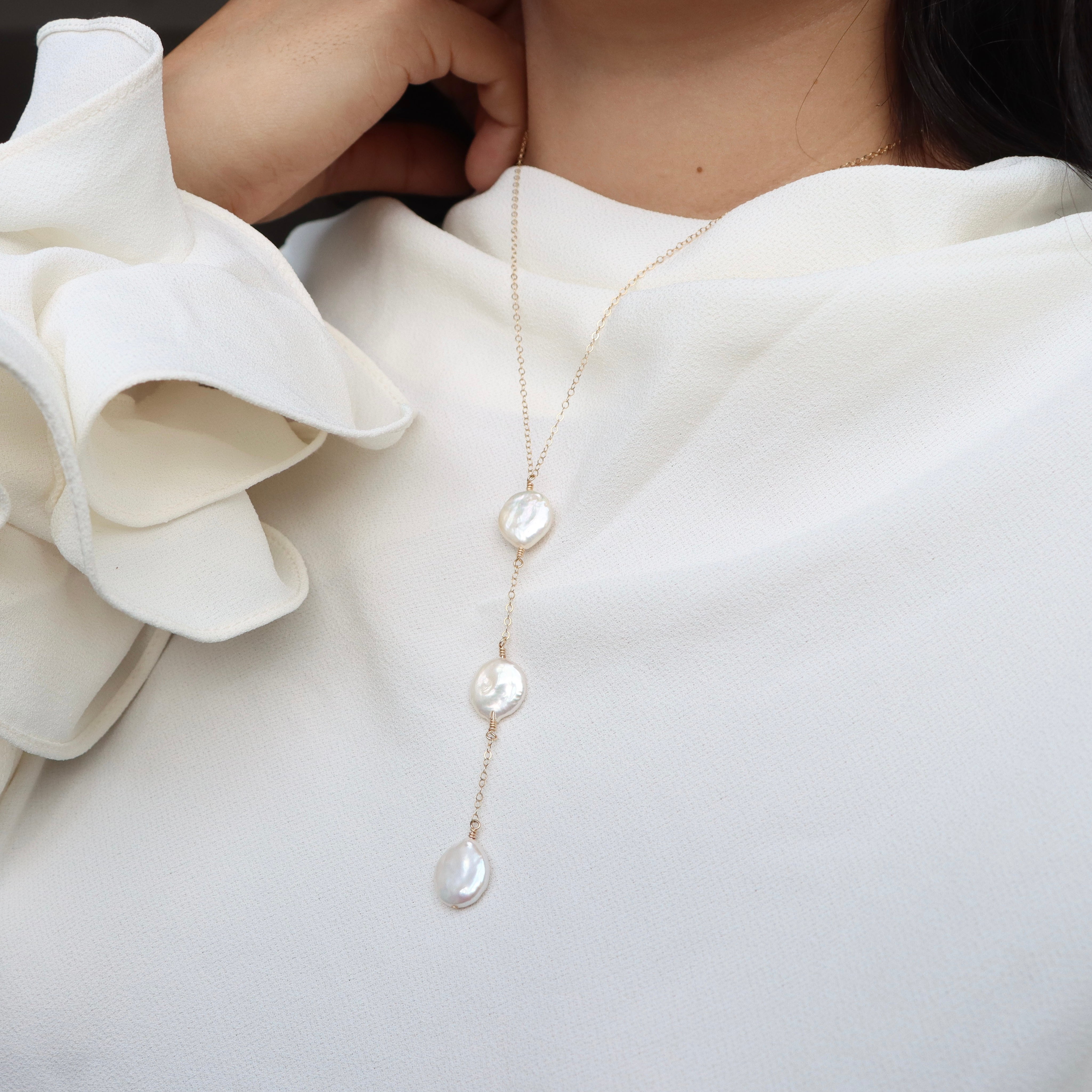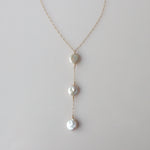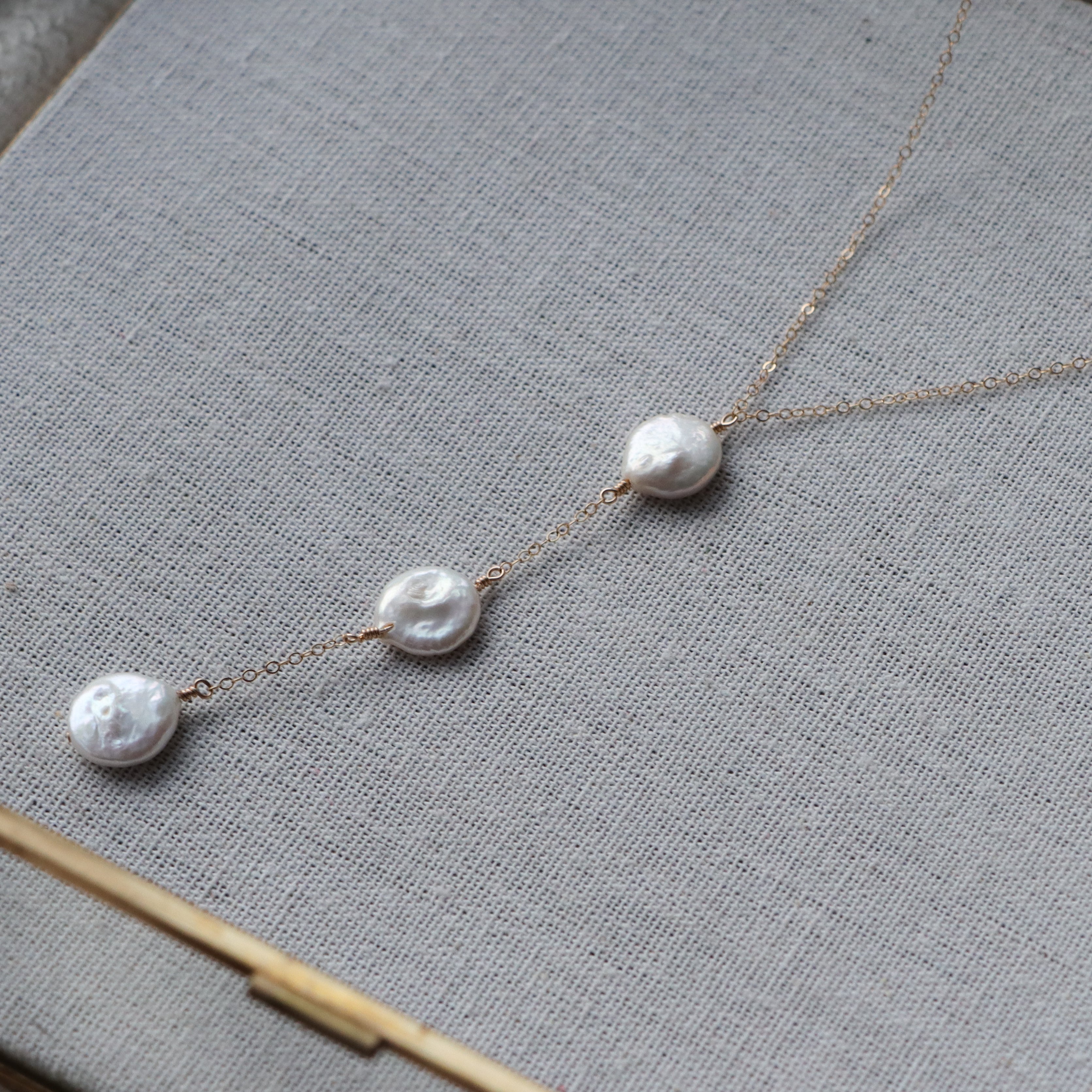 Elegant and timeless, this necklace features three freshwater coin pearls suspended on a delicate 14k gold filled chain. Each pearl is unique in shape and sheen, reflecting soft iridescent tones that catch the light beautifully.